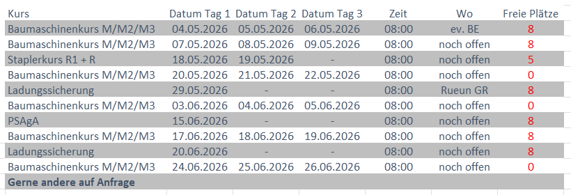 Die Kurse können entweder in Ihrem Betrieb innerhalb der Schweiz oder in unseren Räumlichkeiten durchgeführt werden. Beide Optionen sind zu Ihrem Wunschtermin möglich.